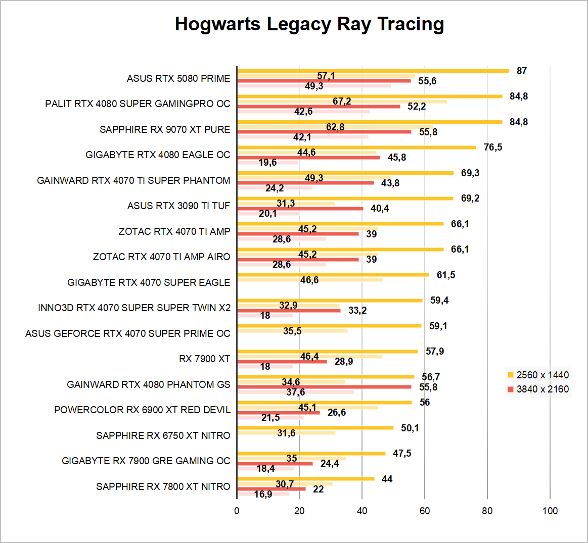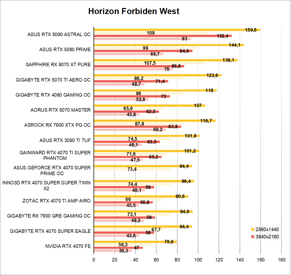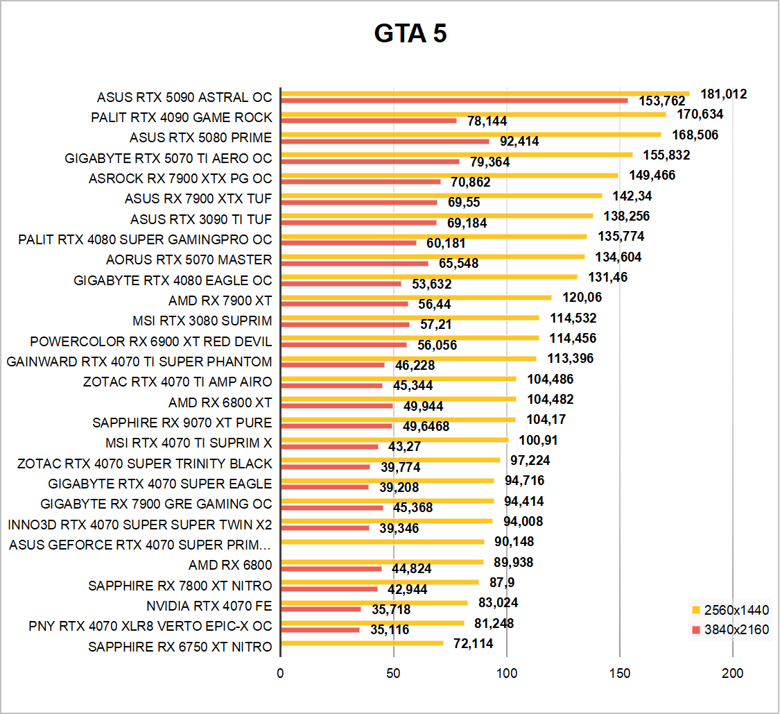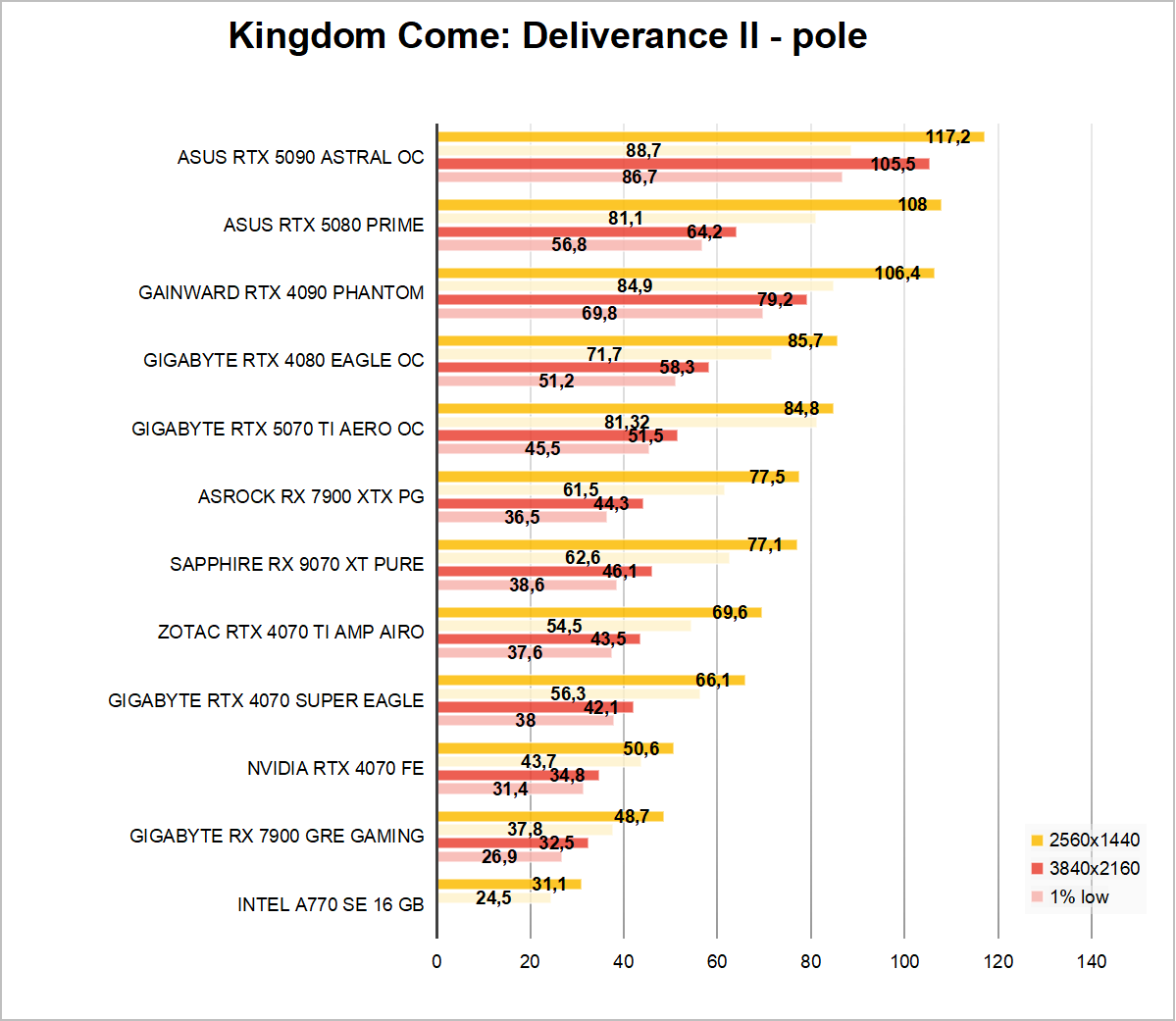 W pierwszej kolejności omówimy kilka starszych i nowszych gier, które nie korzystają z Ray Tracingu. Zgodnie z przypuszczeniami Radeon jest zauważalnie szybszy od swojej zielonej konkurencji. Tak naprawdę Kingdom Come Deliverance 2 i ku zaskoczeniu GTA 5 to jedyne dwa tytuły, w których GeForce RTX 5070 wychodzi na prowadzenie. Do przewidzenia skoro karta AMD została wyceniona drożej.