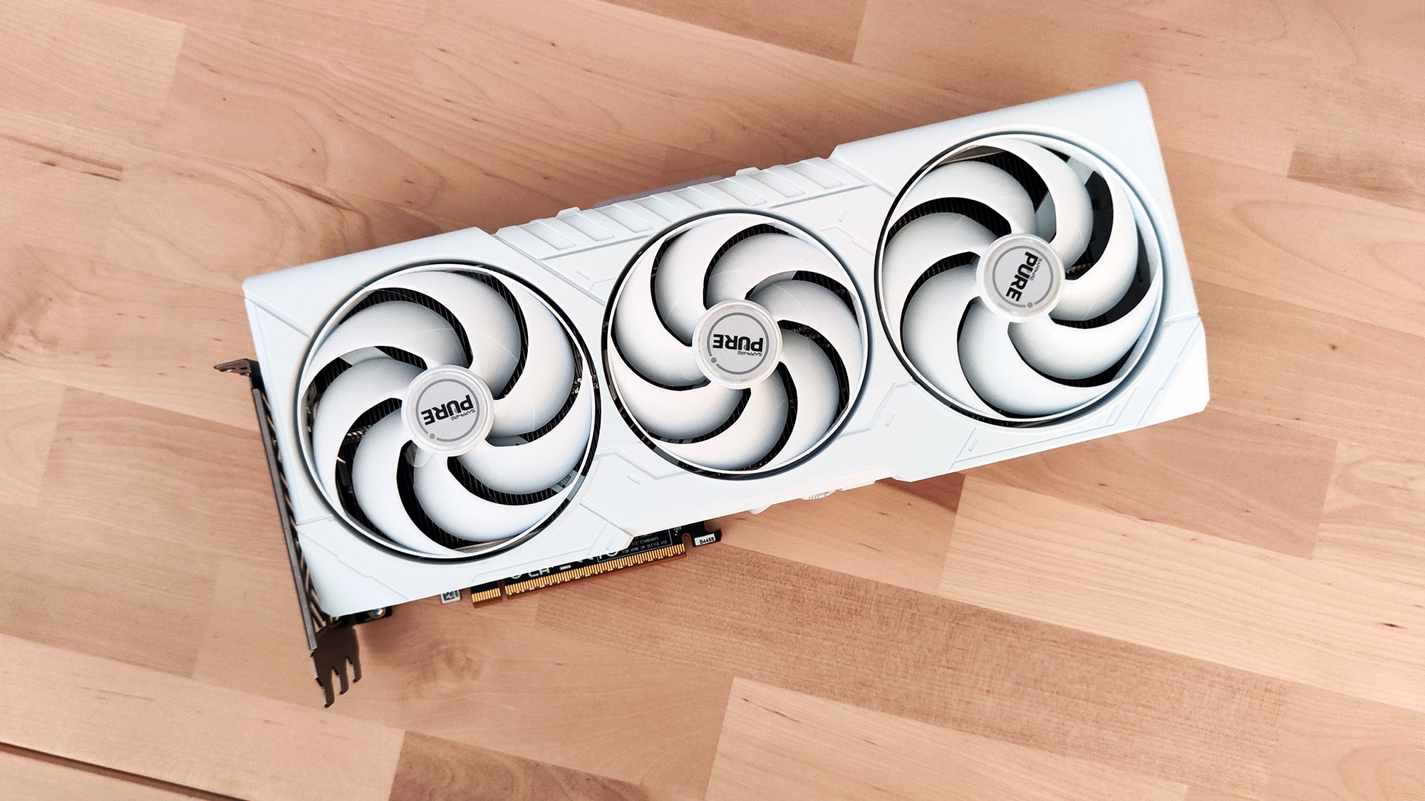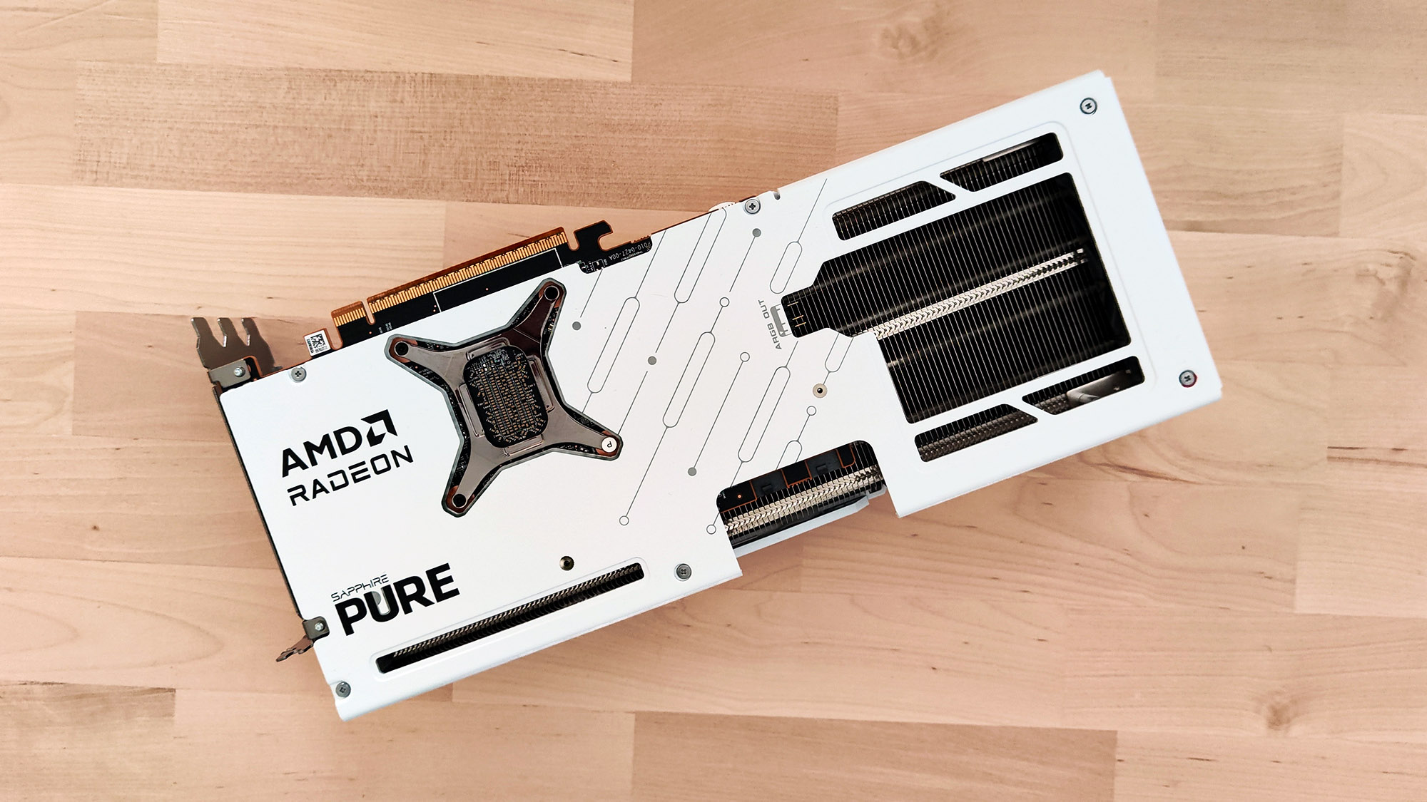 Sapphire Pure wykorzystuje autorską konstrukcję PCB. Zasilanie karty dostarczane jest za pośrednictwem dwóch tradycyjnych, 8-pinowych złączy PCIE. Producent zdecydował się również na podbicie zegarów w przypadku “podkręconego” BIOSu. Zamiast standardowych 2400 MHz Game Clock ma sięgać nawet 246 MHz, a boost ponad 3010 MHz. Kolejną zmianę stosunku do wersji referencyjnej zauważymy w przypadku złącz wideo. Sapphire zrezygnował z jednego gniazda DisplayPort 2.1a, na rzecz drugiego złącza HDMI 2.1b.