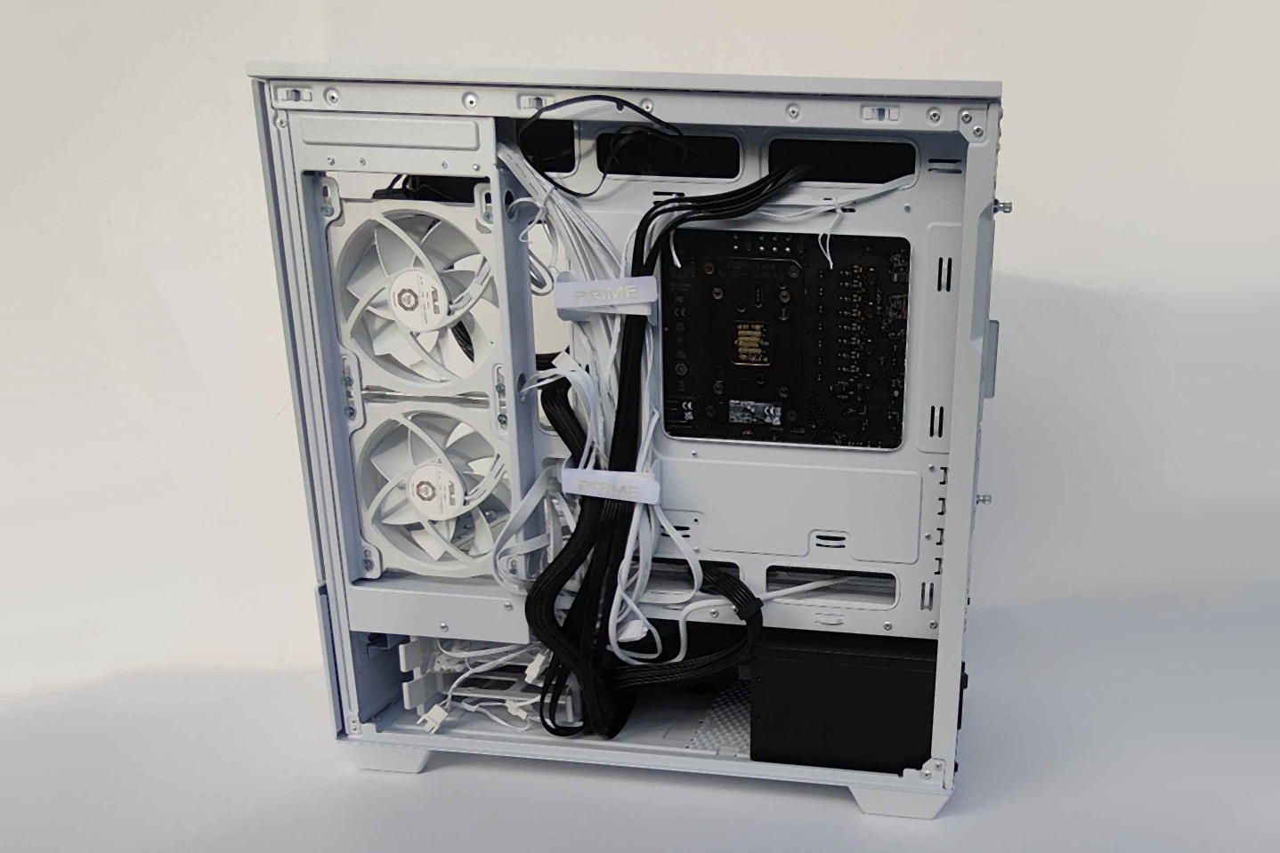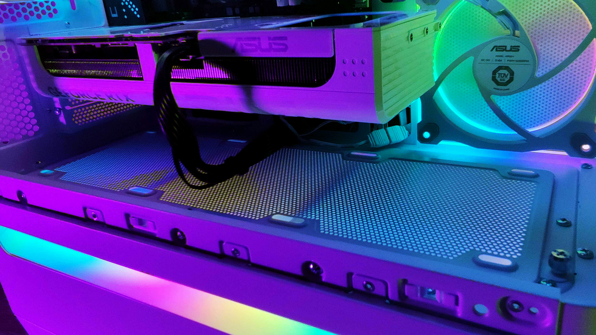 Skoro jesteśmy przy wentylacji, pochylmy się nad fabrycznymi wentylatorami. W testowanej wersji ARGB otrzymujemy trzy jednostki 120 mm (ASUS MR120-1), pracujące z prędkością do 1600 RPM. Ich podświetlenie ARGB jest zintegrowane w ramce, dzięki czemu światło jest miękkie i równomierne, dobrze współgra z białym wnętrzem obudowy i nie przytłacza wizualnie.I tu natrafiłem na największą zagadkę tej konstrukcji. Fabrycznie wszystkie trzy wentylatory ustawione są jako wyciągające powietrze z obudowy (jeden z tyłu i dwa z boku). Oznacza to, że w konfiguracji po wyjęciu prosto z pudełka obudowa tworzy mocne podciśnienie i polega wyłącznie na pasywnych wlotach, głównie przez dolną szczelinę i górny panel. To bardzo nietypowa decyzja.