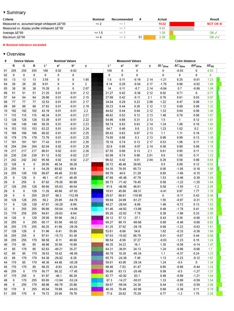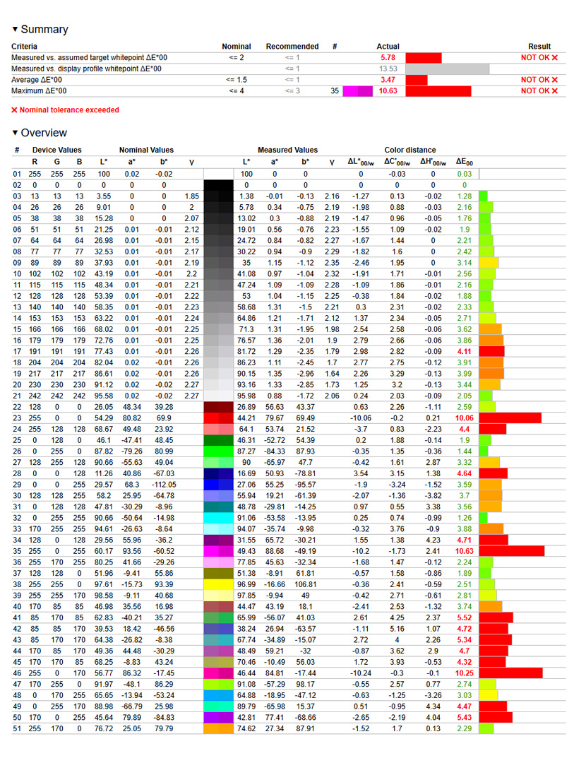 Kolejnym testem było odwzorowanie palety barw. Parametrem, jaki biorę tutaj pod uwagę, jest Delta E. W przypadku telewizorów, jeżeli jest on poniżej 4, uznaję to za wynik dobry. W takim scenariuszu wszelkie odchylenia bardzo ciężko jest uchwycić gołym okiem. W trybie standardowym Delta E dla TCL 65C69K wynosi 3,47, czyli jest w porządku.