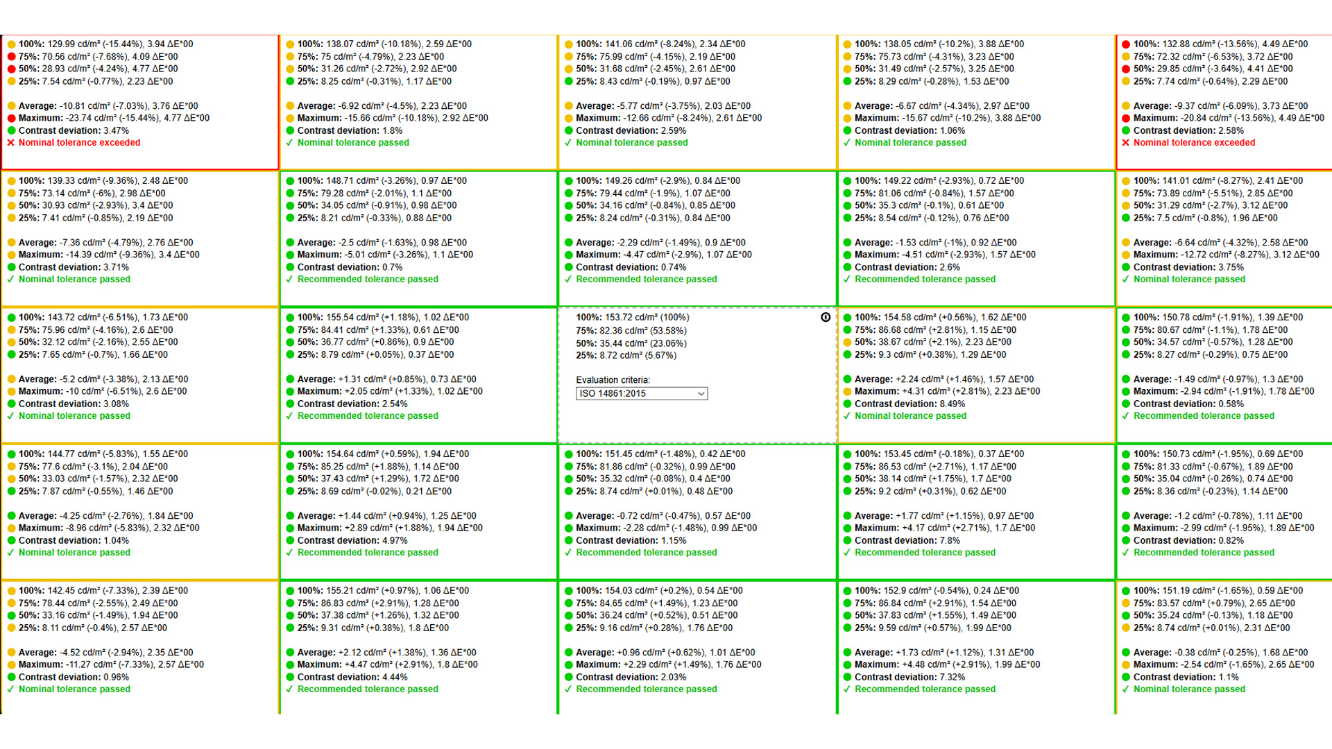 Kolejnym testem było sprawdzenie równomierności podświetlenia ekranu. Tutaj już gołym okiem można było dostrzec, jaki będzie wynik, jednak testy wykonać trzeba. W tym przypadku na powierzchni całego ekranu rozmieszczonych jest 25 plansz. Na każdej z nich badana jest jasność ekranu. Jeżeli w którymś z miejsc odchylenia przekraczają 10%, może to być widoczne gołym okiem w postaci „przyszarzonego” ekranu, bądź wyraźnie ciemniejszego obszaru. W przypadku TCL 65C69K maksymalne odchylenia były daleko od poziomu 10%, w związku z czym nie ma możliwości, aby jakiekolwiek różnice można było zobaczyć gołym okiem.