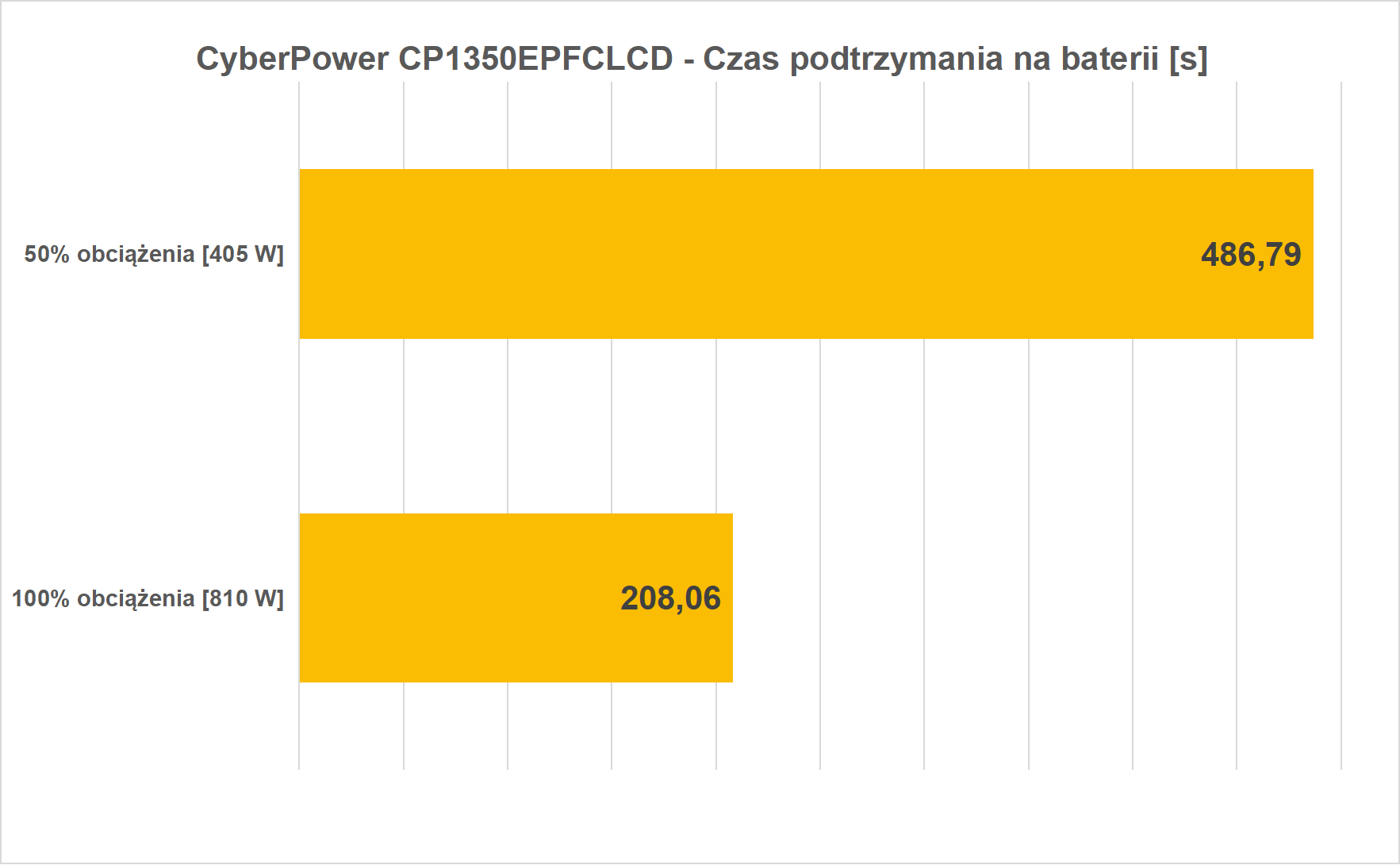 Po całkowitym rozładowaniu urządzenia sprawdziłem jeszcze czas potrzebny na powrót do pełnej gotowości. Akumulator w CP1350EPFCLCD ładuje się w standardowym dla tej klasy tempie, potrzebują 7 godzin i 50 minut , aby wrócić do 100%. To wystarczająco, by UPS odzyskał pełną sprawność jeszcze tego samego dnia.