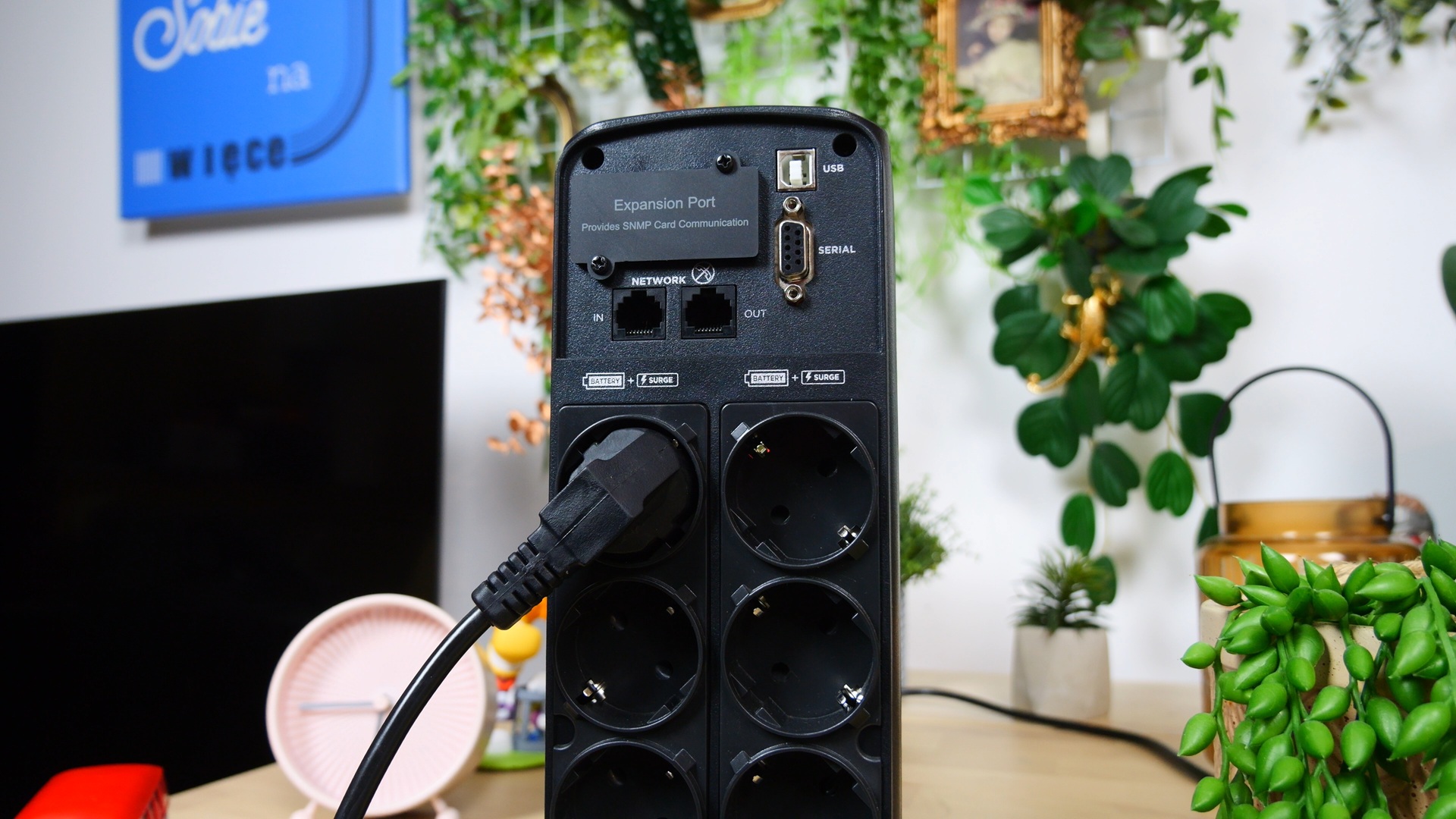 Na samej górze, po prawej stronie tylnej ścianki, znajduje się port USB Type-B służący do komunikacji z komputerem. W tym samym miejscu znajdziemy również gniazda RJ11/RJ45, czyli zabezpieczenie przeciwprzepięciowe dla modemu, routera lub linii internetowej. Nad nimi producent umieścił wnękę ukrytą pod podłużną, zdejmowaną zaślepką. Ta zatoka służy również do montażu dodatkowych akcesoriów i modułów CyberPowera (np. kart sieciowych SNMP). Opcja rzadko spotykana w sprzęcie tej klasy cenowej, a przydatna, jeśli UPS ma stać w małym biurze lub obsługiwać NAS-a.