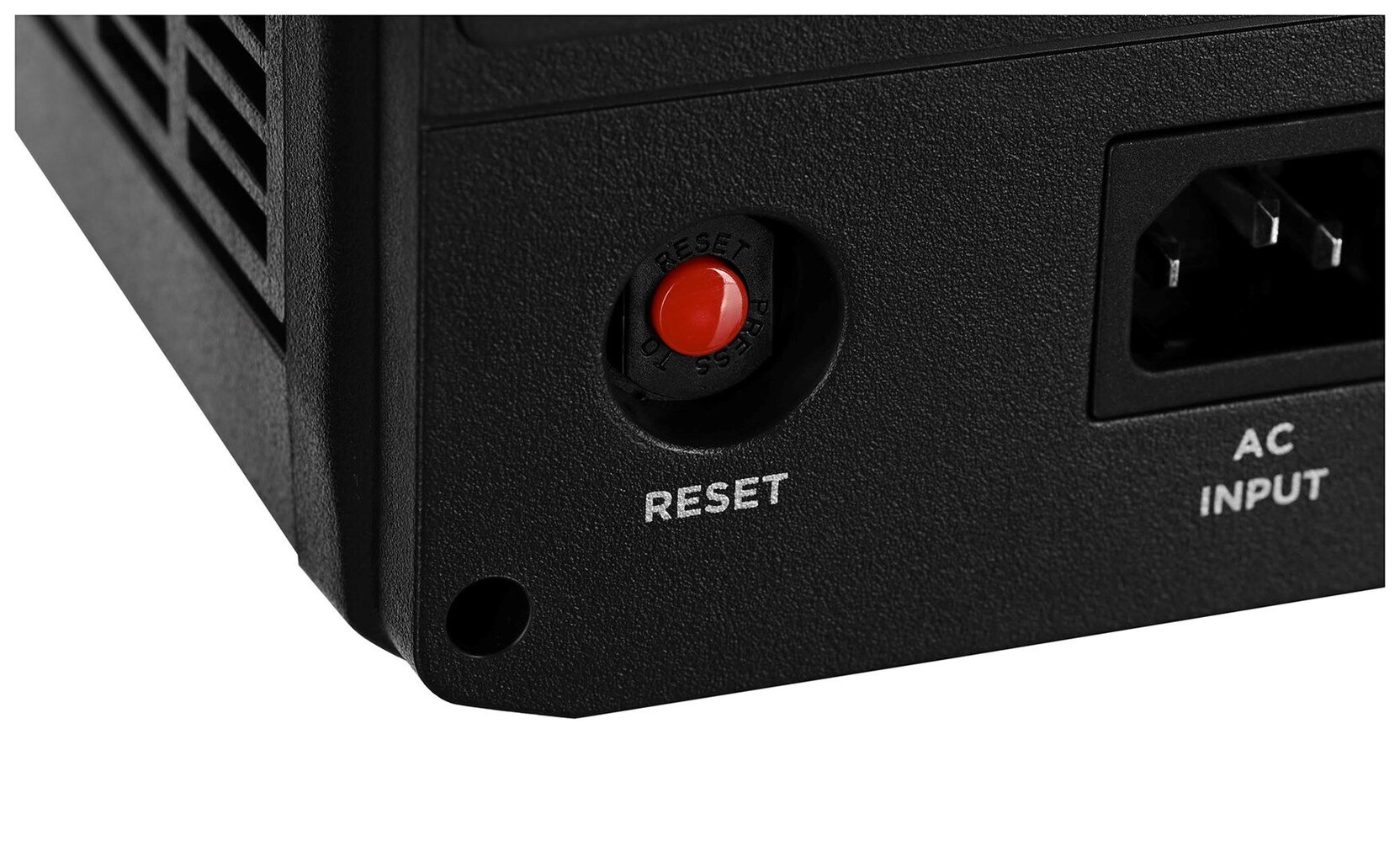 Tylny panel CyberPowera CP1350EPFCLCD został rozplanowany zaskakująco ergonomicznie jak na UPS-a z segmentu domowo-biurowego. Na samym dole umieszczono gniazdo zasilania wejściowego oraz fizyczny przycisk resetu bezpiecznika. Łatwo dostępny, ale jednocześnie na tyle nisko, że nie grozi przypadkowym wciśnięciem.