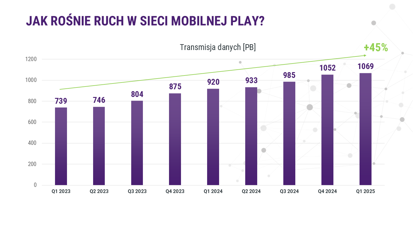 Zwiększający się ruch w sieci Play jest widoczny przez cały rok. Roczny przyrost wykorzystania danych mobilnych wynosi średnio około 20%. Tylko w pierwszym kwartale 2025 roku klienci Play przesłali 1069 petabajtów danych! Co ciekawe, coraz więcej użytkowników korzysta z urządzeń obsługujących 5G – do sieci Play loguje się już 4,9 miliona takich smartfonów.